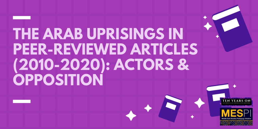 This is part of an effort to mark, interrogate, and reflect on the Arab uprisings, we launch a yearlong set of events, reflections, and conversations. We hope to produce resources for educators, researchers, students, and journalists to understand the last decade of political upheaval historically and in the lived present. For more, visit https://mespi.org/. This is the third of six parts of a series that presents peer-reviewed articles concerned with the Arab uprisings published in 2010-2020 from our peer-reviewed articles database. In this installment, we highlight those focusing on actors and opponents of the uprisings.